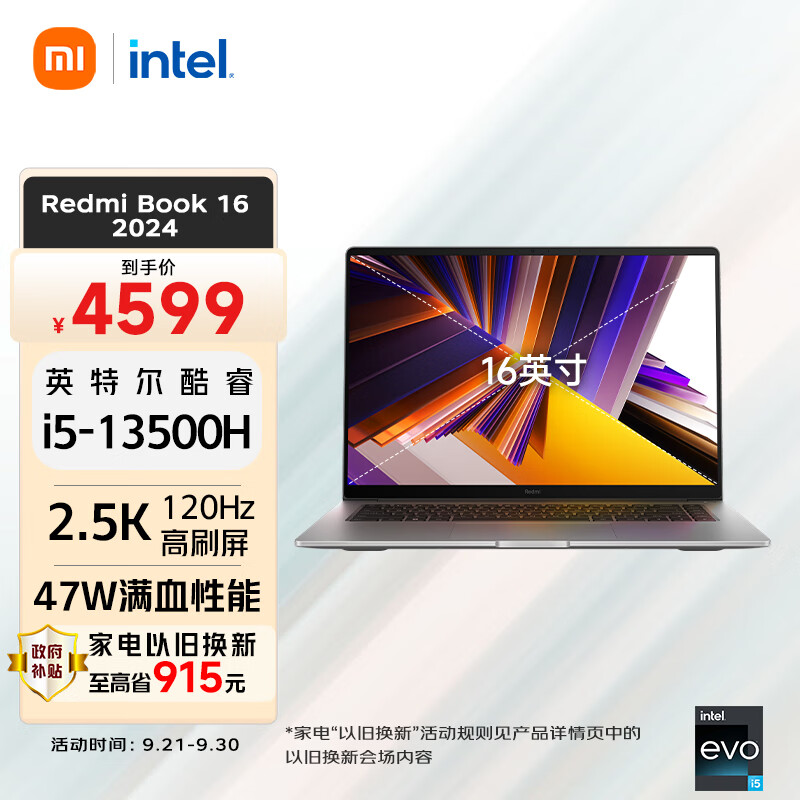 小米笔记本电脑 红米 Redmi Book 16 2024 13代酷睿i5-13500H 2.5K-120hz高刷屏 轻薄本(i5 16G 512G )价格:4599.00元!