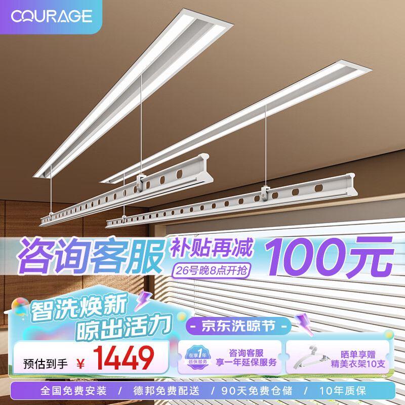 卡瑞琪(COURAGE)电动晾衣架隐形阳台家用隐藏式晾衣架多功能升降晒衣架双杆 2.4米价格:2149.00元!