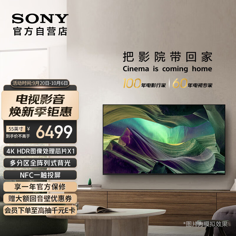 索尼(SONY)【官方直营】KD-55X85L 55英寸 4K HDR 屏智能电视 广色域 120Hz高刷 X1芯片京配上门价格:6499.00元!