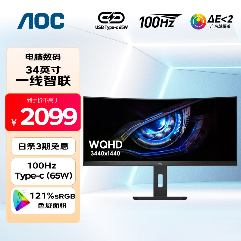 AOC显示器 34英寸 WQHD 1500R曲面带鱼屏21:9 Type-C 65W反向充电 100hz办公游戏设计剪辑显示器 CU34P2C价格:2099.00元!