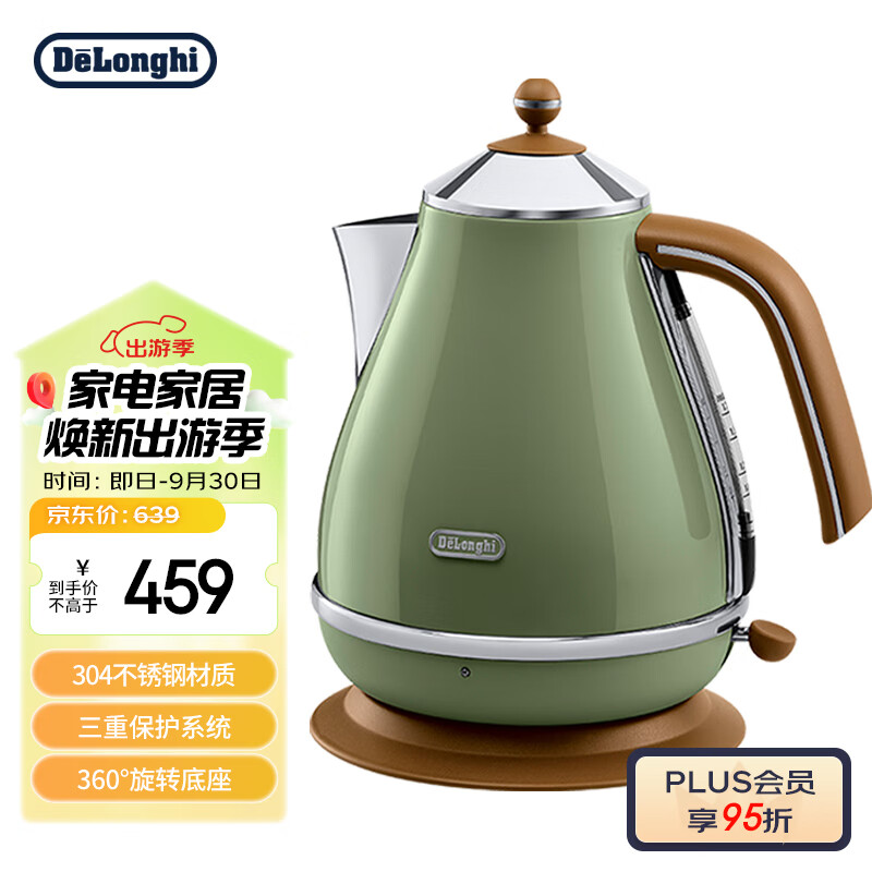 德龙(Delonghi)电热水壶 复古系列烧水壶 家用办公室 304不锈钢 KBOV2001.GR 橄榄绿价格:459.00元!