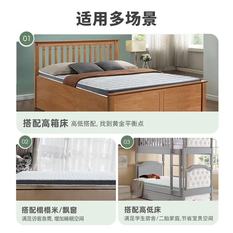 3、发货迅速,床垫软硬很合适,尤其是软面弹性很好,厚度也刚刚好适合高箱床。价格实惠,质量杠杠的,非常好的一次购物,下次还来,东西比我想象中的还要完美,十分给力,值得入手。