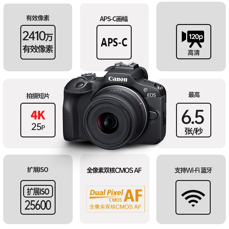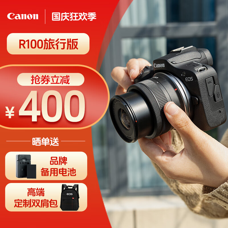 佳能(Canon)EOS r100入门级微单相机 旅行家用学生vlog视频 4k小巧便携半画幅数码相机 R100 18-45标配旅行版价格:8099.00元!