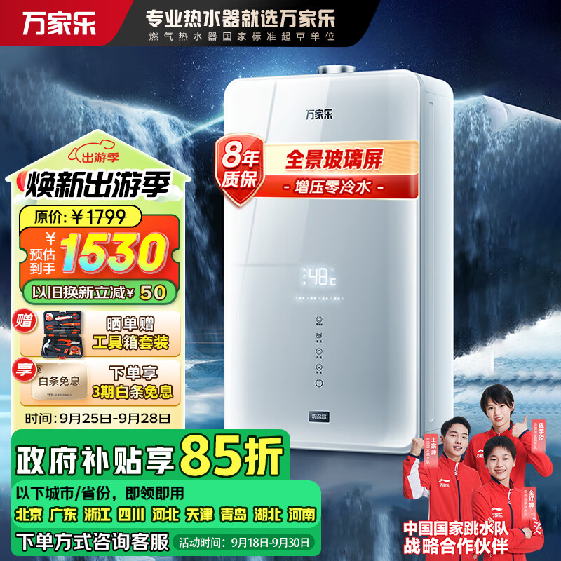 万家乐 16升零冷水燃气热水器(天然气)增压大水量玻璃屏智能防冻三巡航模式以旧换新JSQ30-16D10S价格:1799.00元!