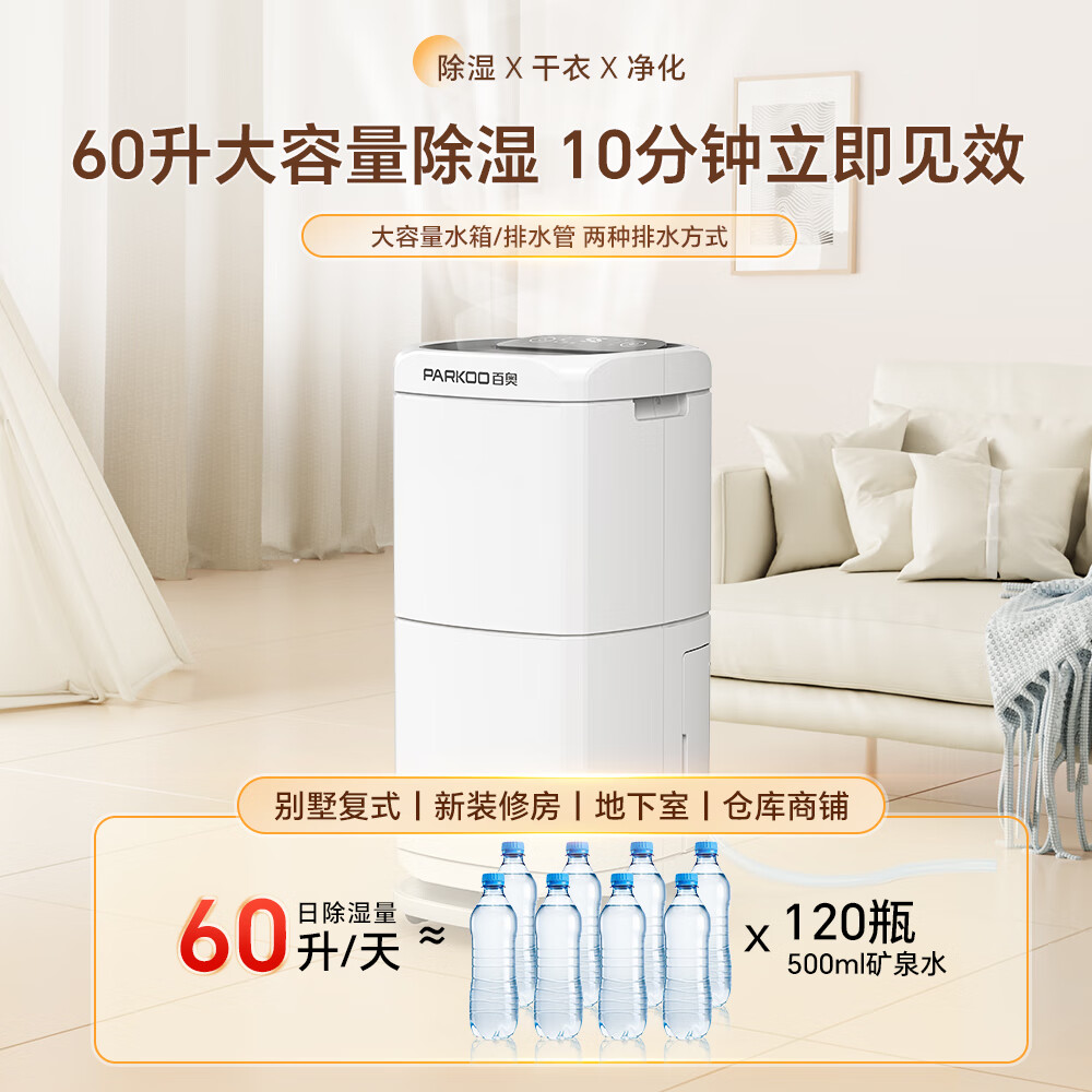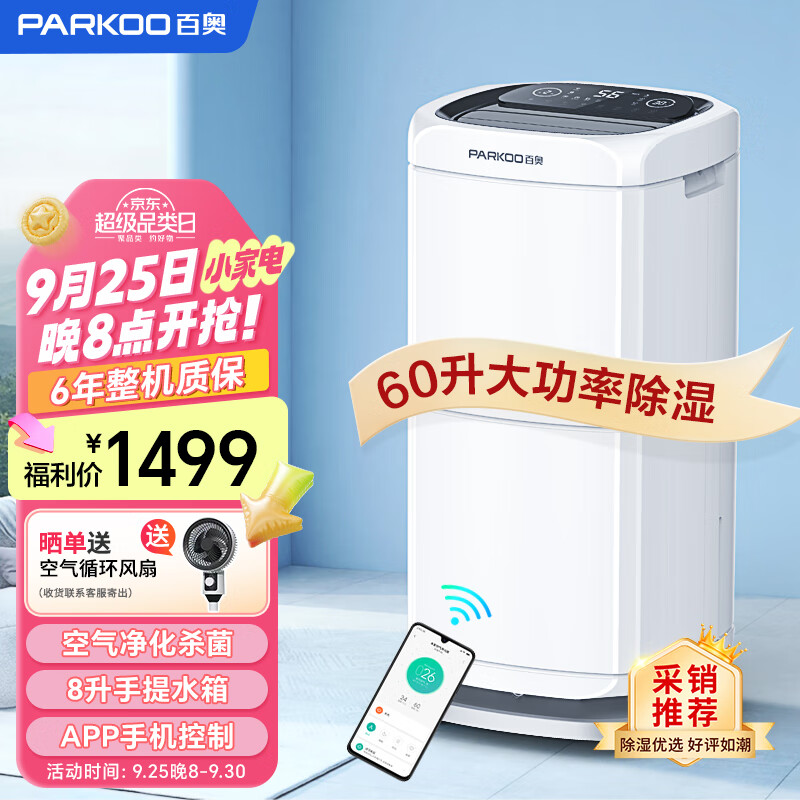 百奥(PARKOO)除湿机/抽湿机 除湿量60升/天 App控制 空气净化 家用地下室复式别墅商用工业吸湿器 PD602AR价格:1899.00元!