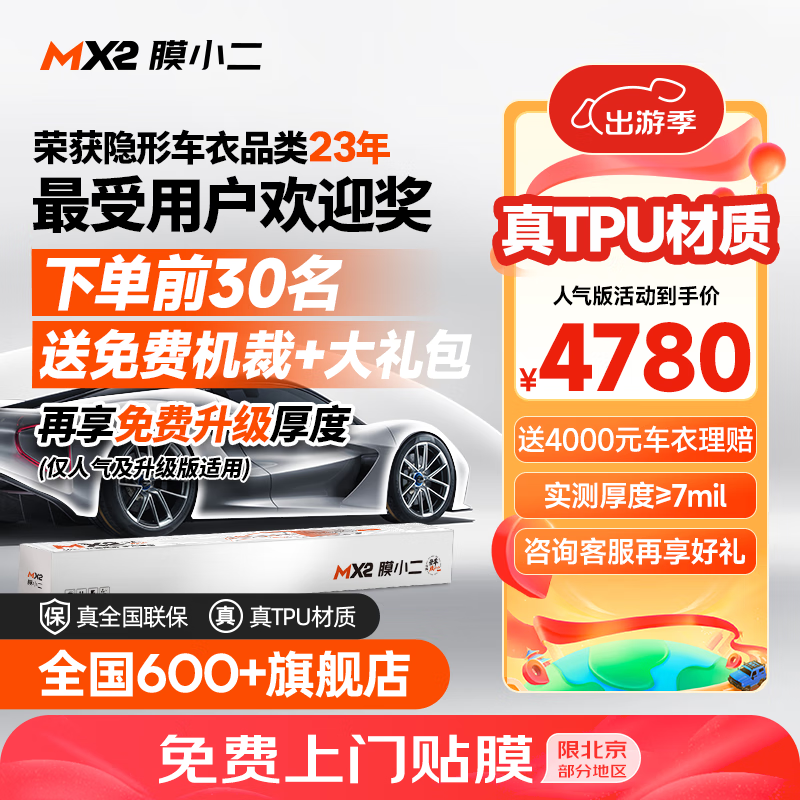 膜小二(MOXIAOER)隐形车衣膜全车身膜TPU材质防刮蹭透明膜车衣漆面保护膜包施工价格:4780.00元!