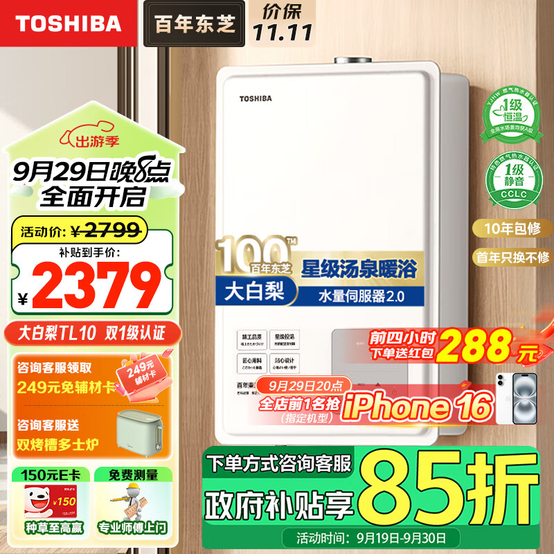 东芝(TOSHIBA)16升大白梨TL10 燃气热水器天然气 一级恒温增压水伺服2.0 一级静音下置风机 日式外观JSQ30-TL10价格:3299.00元!