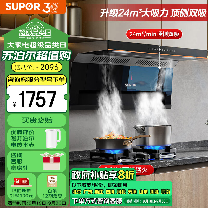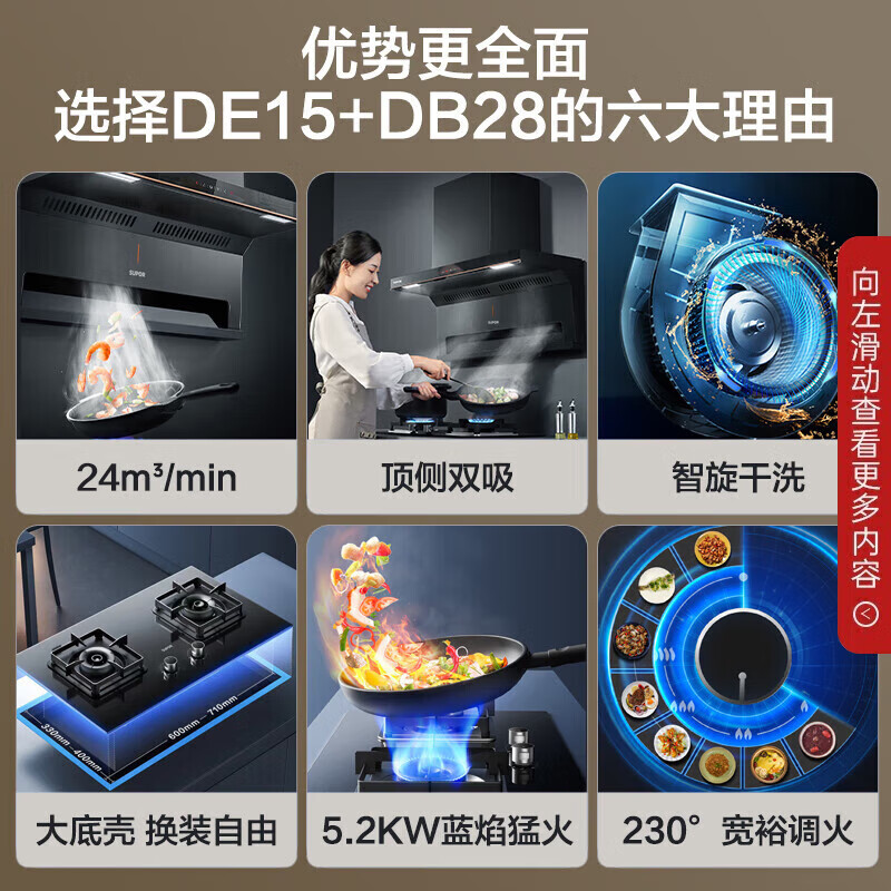 苏泊尔(SUPOR)抽油烟机 顶侧双吸7字型烟灶套装24立方挥手免拆洗家用烟机燃气灶具套装DE15+DB28天价格:2096.00元!