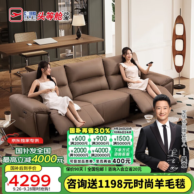 芝华仕(CHEERS)头等舱贵族皮沙发零靠墙复古新中式电动功能小户型家具30269棕三价格:6199.00元!