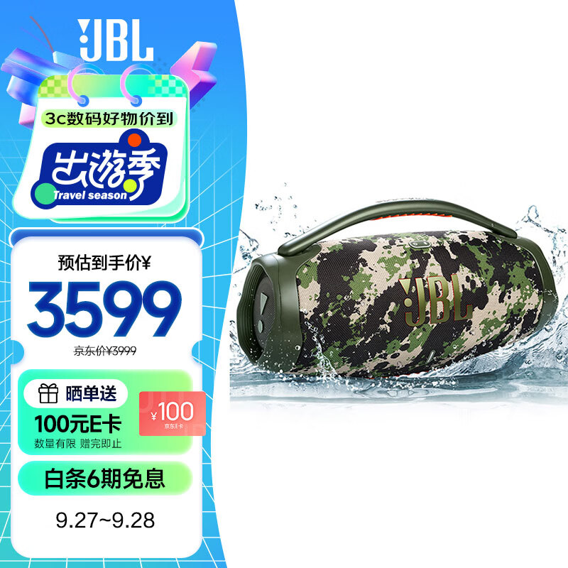 JBL BOOMBOX3 音乐战神三代 便携蓝牙音箱 低音炮 户外音箱 IP67防尘防水 Hifi音质 桌面音响 迷彩色价格:3599.00元!