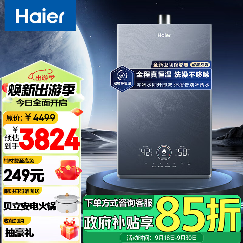 海尔(Haier)16升【国补换新立减15%】【恒星KN7S】增压零冷水燃气热水器天然气双循环恒温 JSQ31-16KN7SFRAGU1价格:4499.00元!