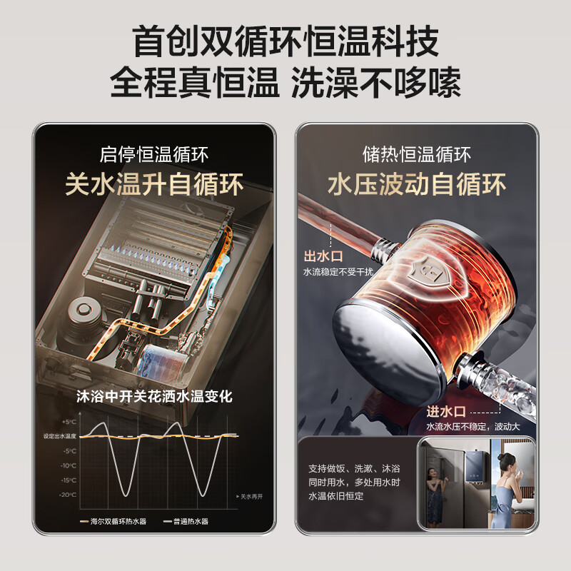 4、安装师傅很负责,安装速度也很快,挑选了很多就看中了这个,家电都是海尔的,这个水压也大,静音效果非常好,比我原来的那个好太多了,目前使用温度波动非常小,几乎感觉不到水温波动,非常满意