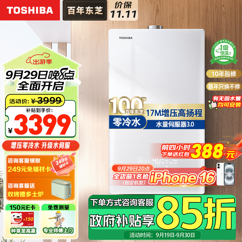 东芝(TOSHIBA)16升大白梨TS5 燃气热水器天然气 一级恒温水伺服 一级静音下置风机 增压零冷水玻璃面板JSQ30-TS5价格:3999.00元!