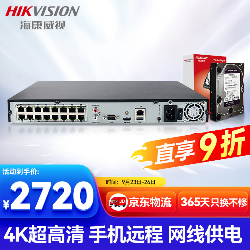 HIKVISION海康威视网络硬盘录像机监控POE网线供电满配16个摄像头带6T硬盘DS-7816N-K2/16P价格:3056.00元!