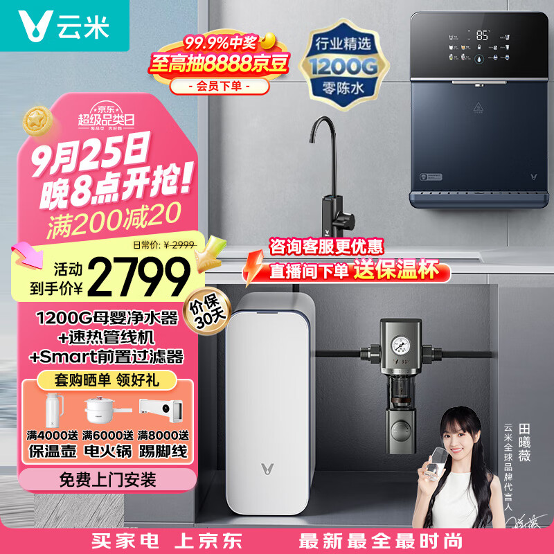 云米(VIOMI)Super Y 1200G全屋净水套装净水器+管线机Master2S+前置过滤器VF4-A三件套家用直饮加热净水器价格:2999.00元!