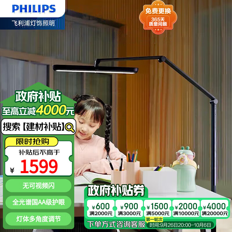 飞利浦(PHILIPS)护眼灯台灯学习国AA级全光谱学生儿童卧室A5立式落地护眼台灯价格:1749.00元!