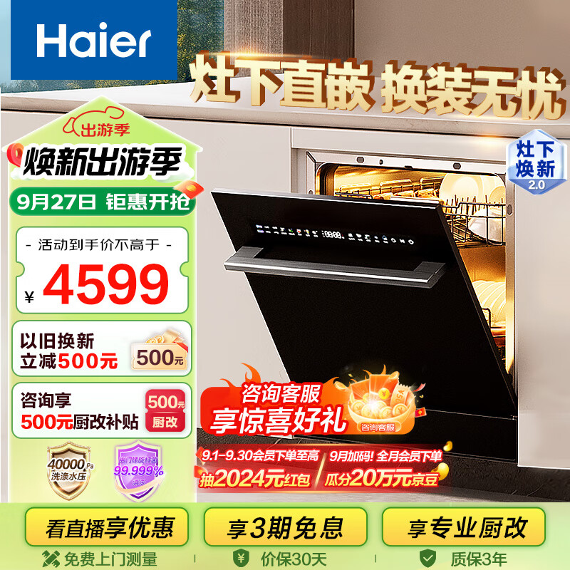 海尔(Haier)14套嵌入式灶下洗碗机焕新家Z11 双80℃消杀 一级水效变频 智能开门速干 7天存储EBW14327GHU1价格:4599.00元!