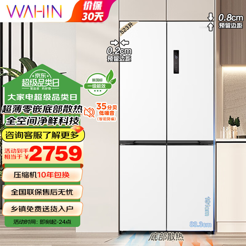 华凌549超薄零嵌入十字双开四门冰箱白色大容量风冷无霜一级能效底部散热以旧换新家电国补HR-549WUSPZ价格:2759.00元!