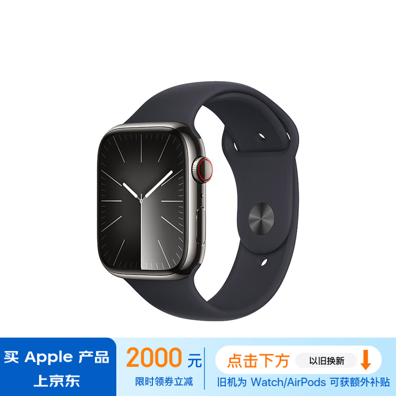 Apple/苹果 Watch Series 9 智能手表GPS+蜂窝款45毫米石墨色不锈钢表壳午夜色运动型表带M/L MRPP3CH/A价格:6199.00元!