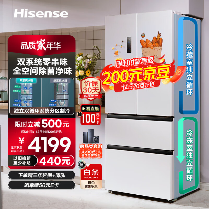 海信(Hisense)525L四开门多门法式家用电冰箱一级能效风冷无霜白色全空间净化双系统双循环BCD-525WNK1PU-CY34价格:5099.00元!