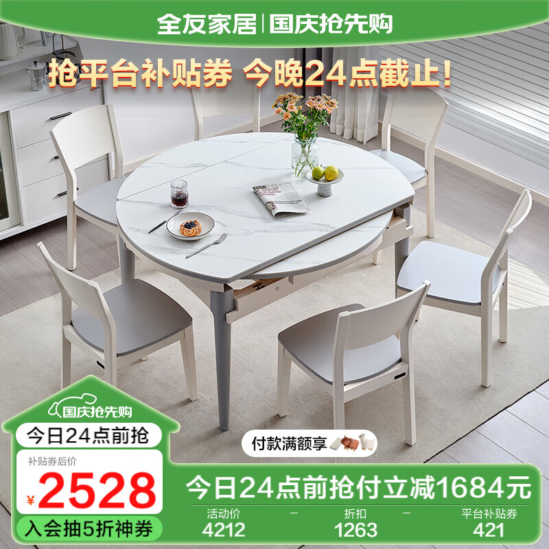 全友家居 现代简约餐桌椅组合家用吃饭桌子可伸缩折叠岩板餐桌DW1028价格:4212.86元!