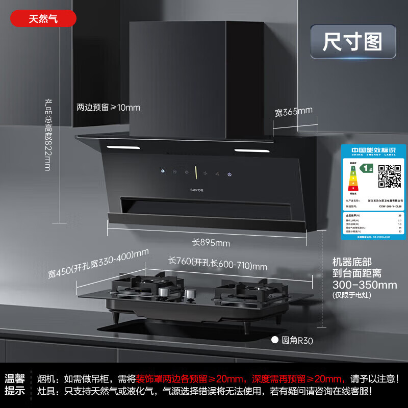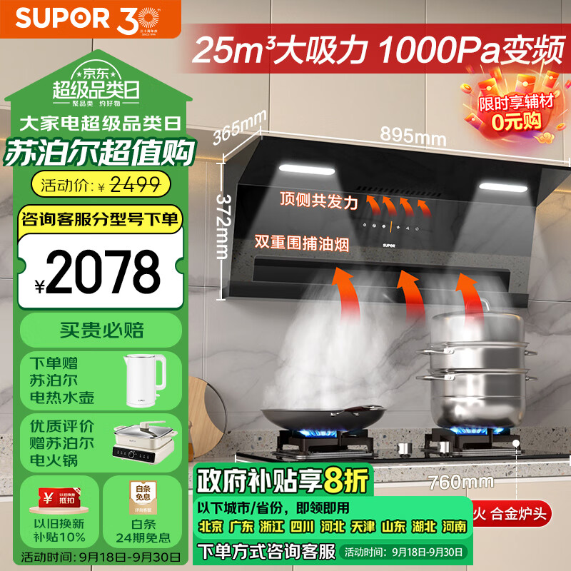 苏泊尔(SUPOR)抽油烟机 顶侧双吸1000帕变频吸油烟机灶具 25立方 5.2KW烟灶套装 DL36+DB28天然气价格:2499.00元!