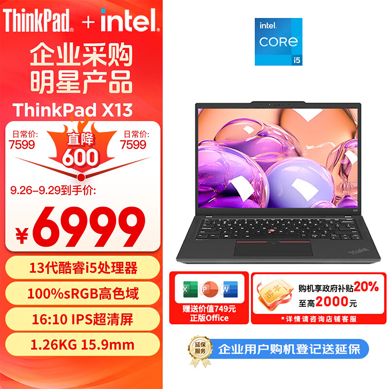 ThinkPad X13 联想13.3英寸轻薄便携笔记本电脑 13代酷睿i5-1340P 16G 512G vPro 商务办公本(2GCD)价格:6999.00元!