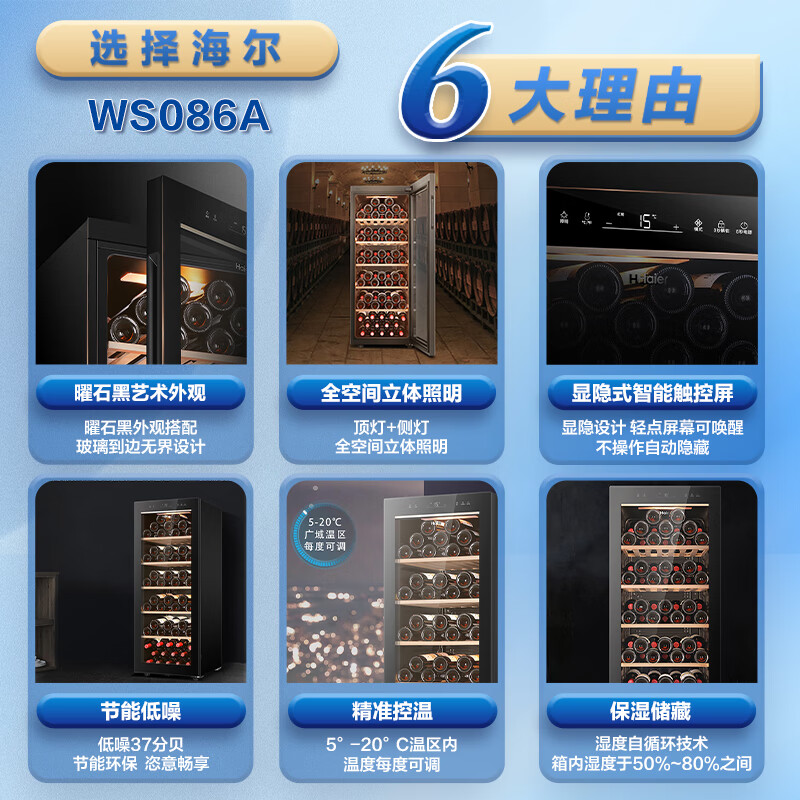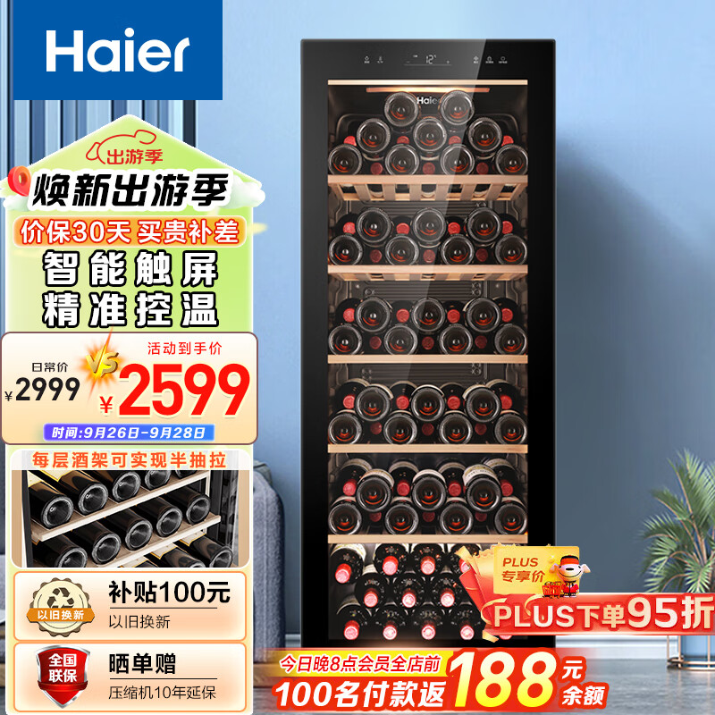 海尔(Haier)198升86瓶装家用恒温红酒柜 客厅办公室葡萄酒冷藏酒柜WS086A 以旧换新价格:2599.00元!