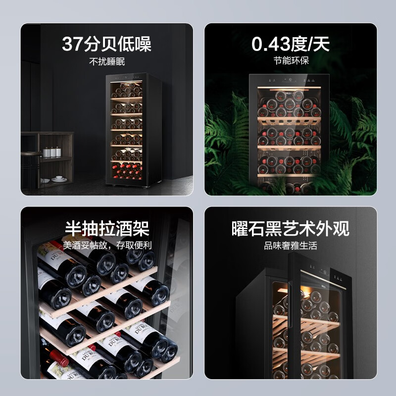 3、海尔86瓶装恒温酒柜,价格比别人家贵不少,买来存葡萄酒和绿茶,操控还是很方便的,颜值对我来说也没那么重要,放在楼梯间储藏室里的。买的时候没注意,这个价位居然是二级能效!工作时有一点声音的