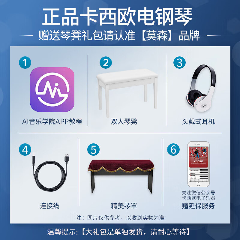 5、大小合适节省空间除了组装有点麻烦其他都不错送的耳机和琴凳也都是品牌的声音还好听的手感也不错操作起来也简单明了有个琴盖特别好防灰尘又美观京东物流有保障京东自营没错