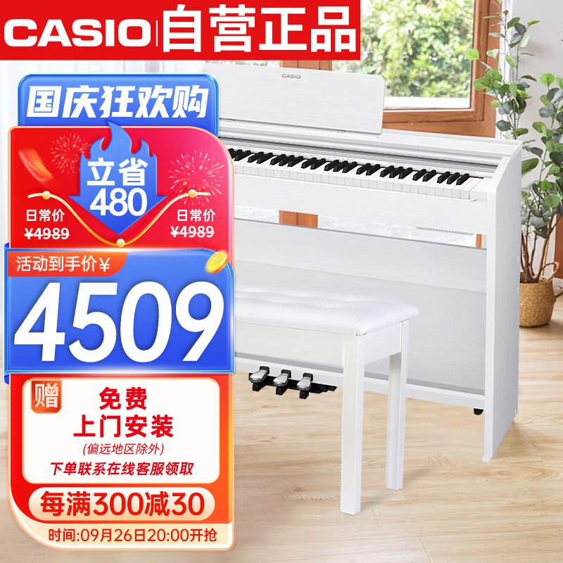 卡西欧(CASIO)电钢琴 PX870白色立式成年人儿童88键重锤智能APP互动分享+琴凳价格:4989.00元!