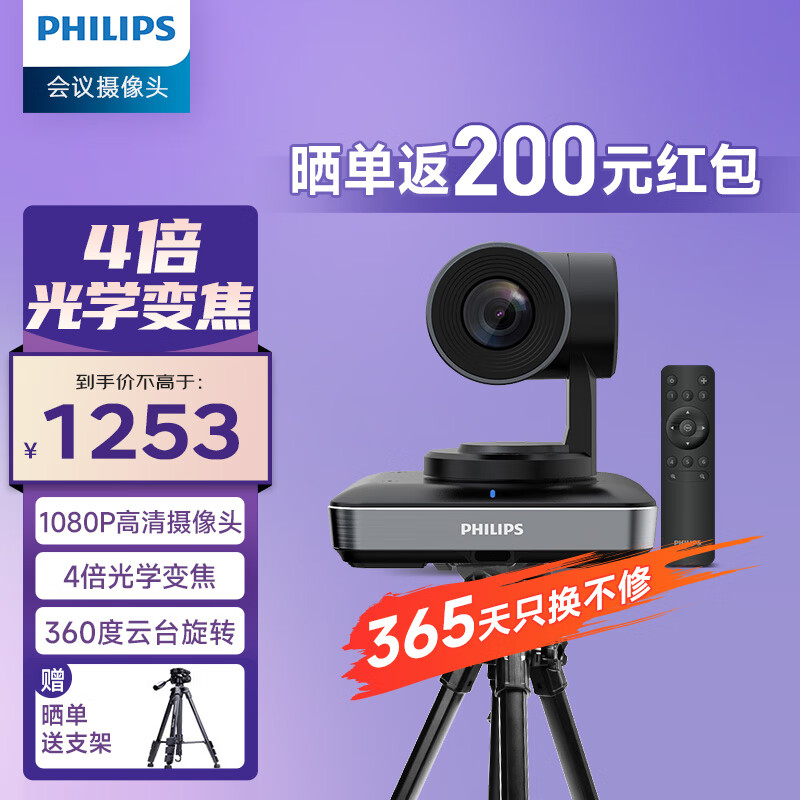 飞利浦电脑摄像头1080P高清视频会议摄像头 4倍光学变焦 340°云台旋转 直播教育网课摄像机PSE0600C价格:1253.00元!
