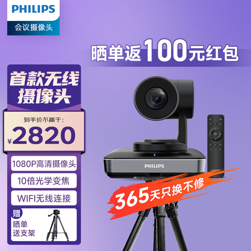飞利浦电脑摄像头 10倍变焦340°云台 高清视频会议摄像头USB电脑笔记本台式机网课1080P0600PLUS无线款价格:2820.00元!