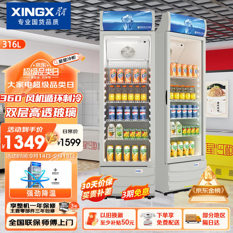 星星(XINGX) 316升 立式玻璃门展示柜冷柜 饮料陈列柜 商用冷藏冰箱(银灰色) LSC-316C价格:1349.00元!