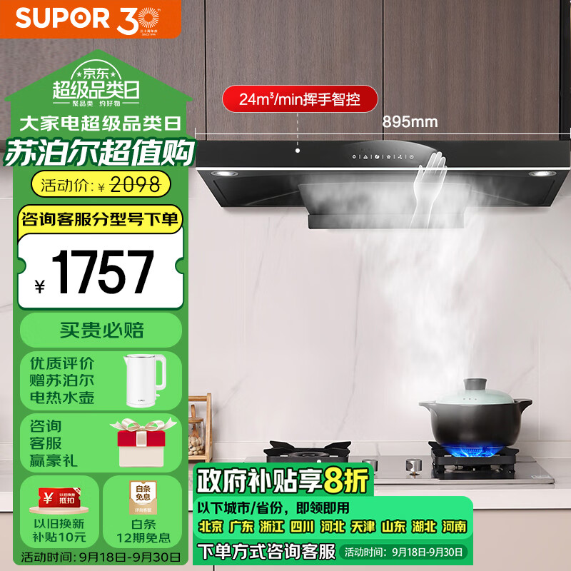 5、24立方的苏泊尔烟机,超大吸力,美观大气,操作简单,挥手感应,活动时购买价格优惠,声音不大,小巧,关机后自动清洗,灶具5.0功率火力大,爆炒效果好,物流快,适宜再次回购。