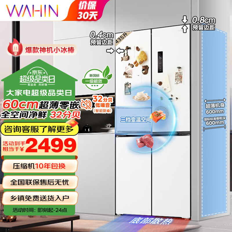 华凌神机小冰棒 美的出品60cm超薄零嵌入白色冰箱十字四开门一级能效节能风冷无霜底部散热HR-456WUSPZ价格:3099.00元!