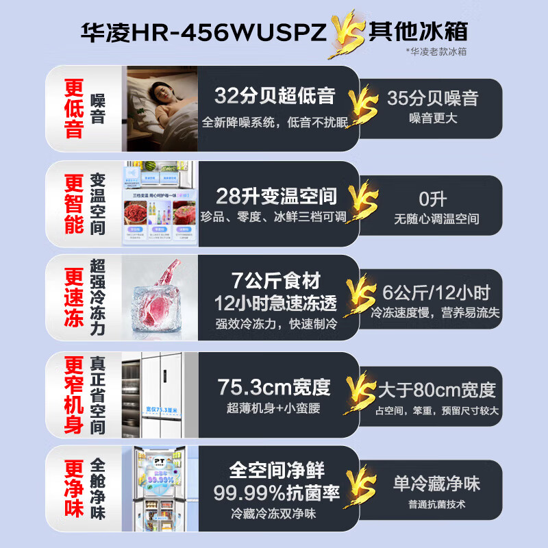 这款华凌HR-456WUSPZ的质量参数,还有这款的开始销售的时间和用户的评价等等,如果你对此款感兴趣的话,不妨一起来瞧一瞧!冰箱颜值很高,双十一活动价格很美丽,优惠不少,和美的457除了品牌标识不一样,其他基本一模一样,一家三口足够用了,而且试着通了会儿电,基本没什么声音,还没搬家,具体使用情况如何,后续追评