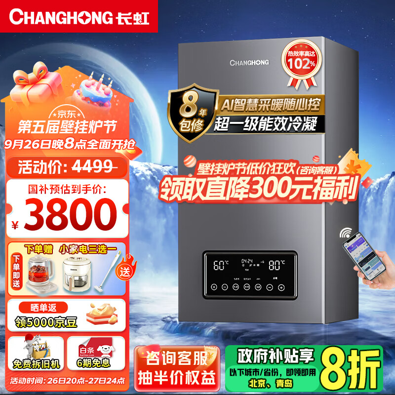 长虹(CHANGHONG)燃气壁挂炉家用供暖淋浴一级能效冷凝式节能省气APP智控暖气片地暖恒温以旧换新LL1PBD24-C6价格:4499.00元!