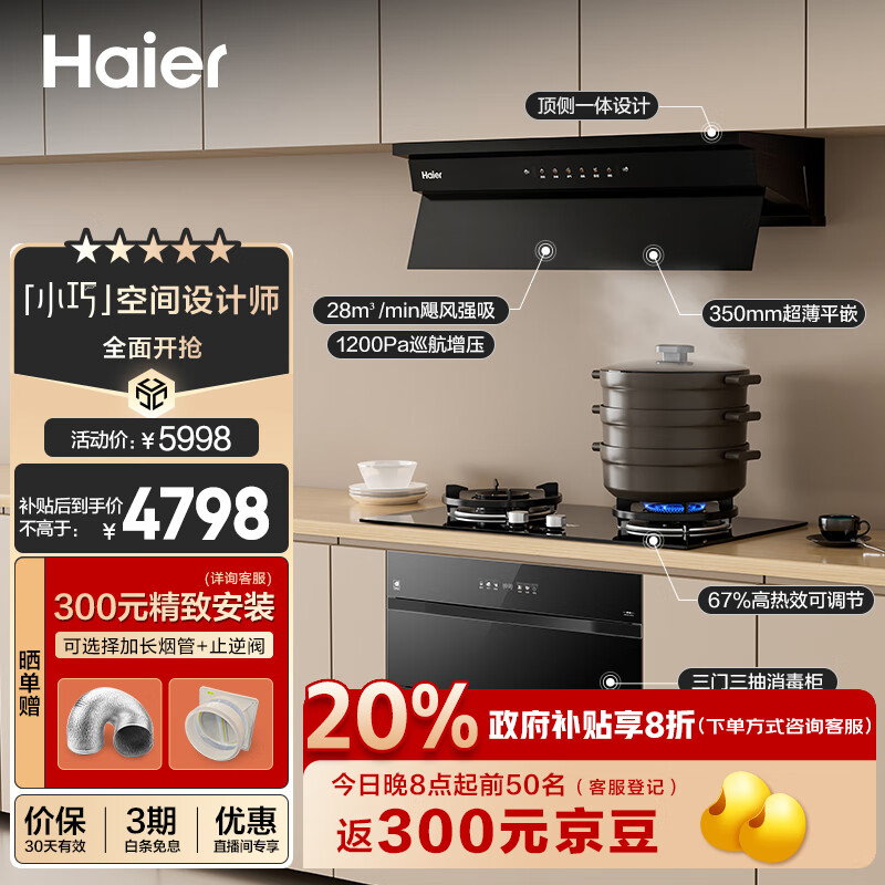 海尔(Haier)抽油烟机 【小巧】欧近一体烟灶套装 烟灶消三件套 变频28风量 130L三层大容积C50+Q2BEA+EB130价格:6664.00元!