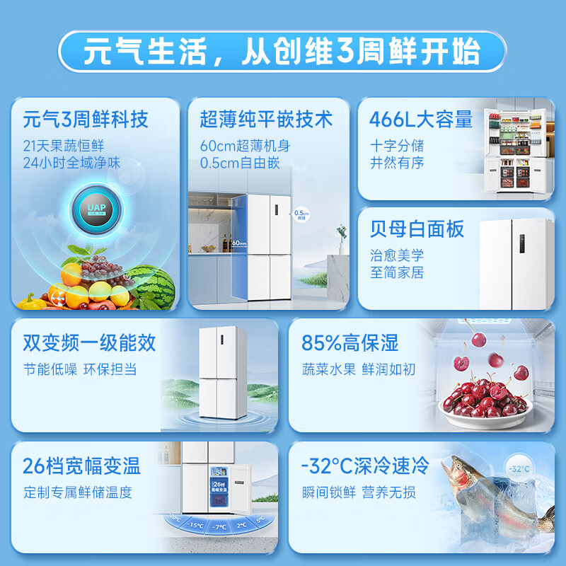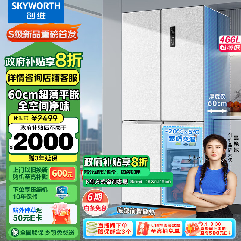 创维冰魔方 466升十字对开四开门60cm超薄平嵌入式家用冰箱白色大容量底部散热BCD-466W4QB1价格:2699.00元!