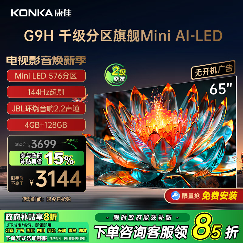 康佳电视65G9H 65英寸 Mini LED 576分区 4K超高清144Hz屏 4+128G智能游戏电视 二级能效以旧换新价格:3699.00元!
