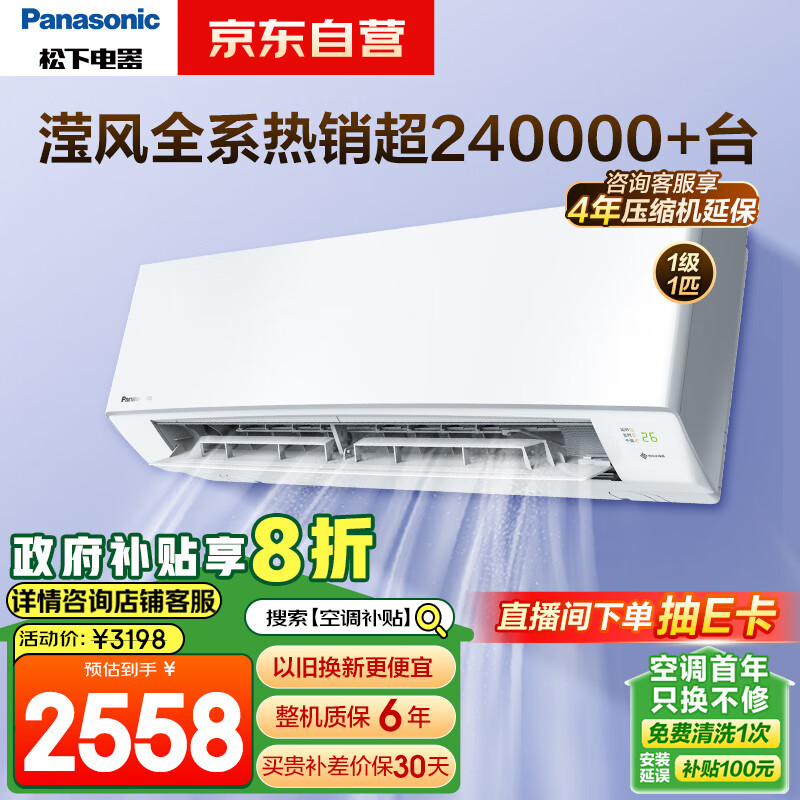 松下空调滢风系列 大1匹 新一级能效 变频冷暖空调挂机 WIFI智能内部洁净ZY26K210 以旧换新政府补贴价格:3134.30元!
