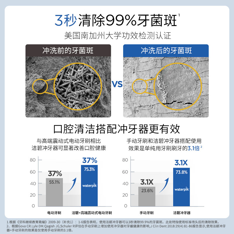 1、牙医介绍的品牌,入手后感觉非常帮,比牙刷清洁的干净,全家人都在使用这款冲牙器,这是入手的第四个了,方便携带,使用简单,水流强劲。是一款非常棒的冲牙器