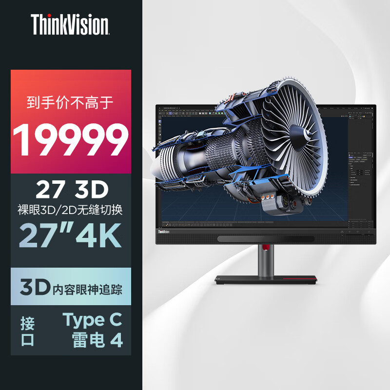 联想ThinkVision27英寸4K IPS Type-C护眼认证HDR裸眼3D/2D切换内容眼神追踪 建模3D动画学习3D显示器价格:19999.00元!