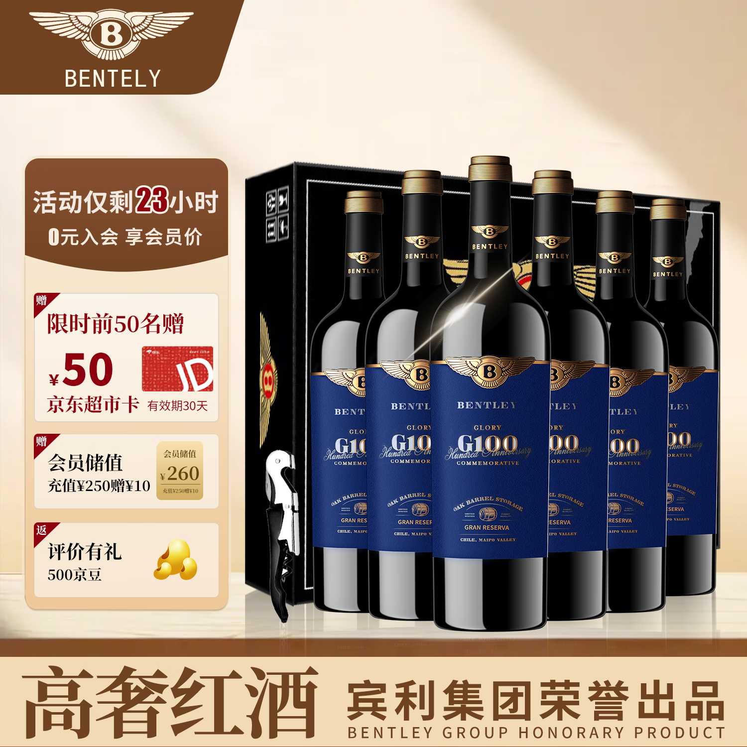 宾利(BENTLEY)智利原瓶进口红酒纪念版珍藏级干红葡萄酒750ml*6瓶整箱装送礼价格:1138.00元!