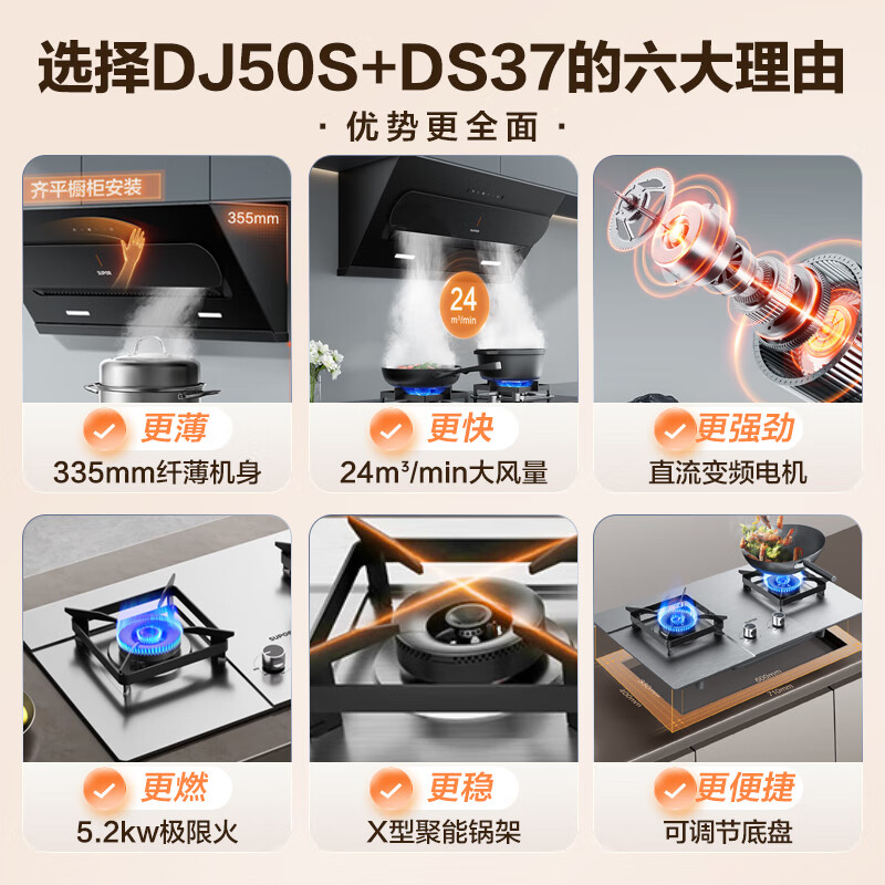 苏泊尔(SUPOR)抽油烟机 24m3/min大吸力 变频侧吸式脱排抽吸油烟机家用 挥手智控免拆洗烟灶套装 DJ50S+DS37天价格:1999.00元!