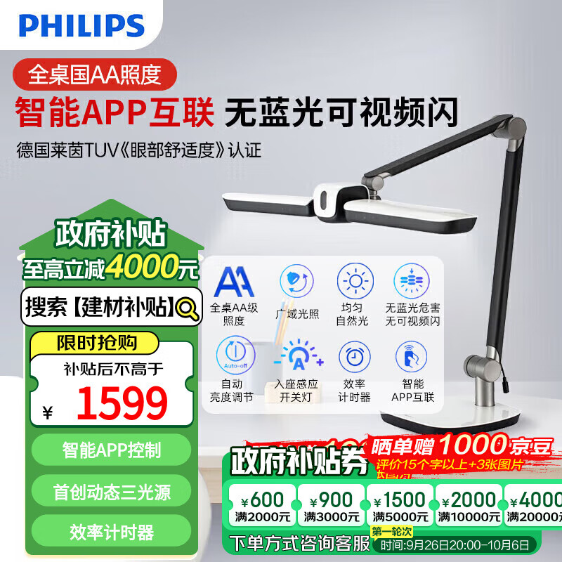 飞利浦(PHILIPS)护眼学习台灯全光谱儿童护眼台灯国AA级学生阅读台灯A7价格:1749.00元!