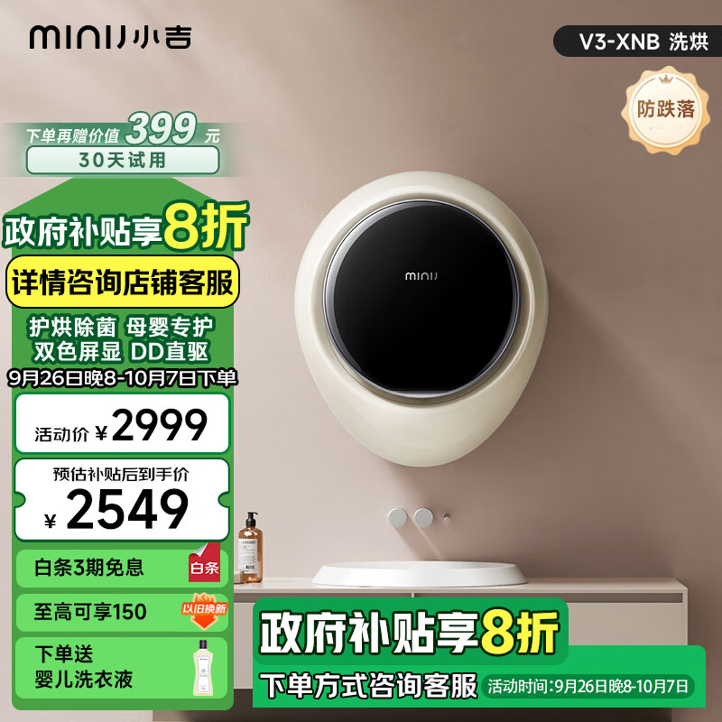 小吉(MINIJ)壁挂洗衣机 婴儿宝宝儿童全自动智能滚筒 壁挂式洗衣机迷你变频洗烘一体V3-XNB价格:2999.00元!