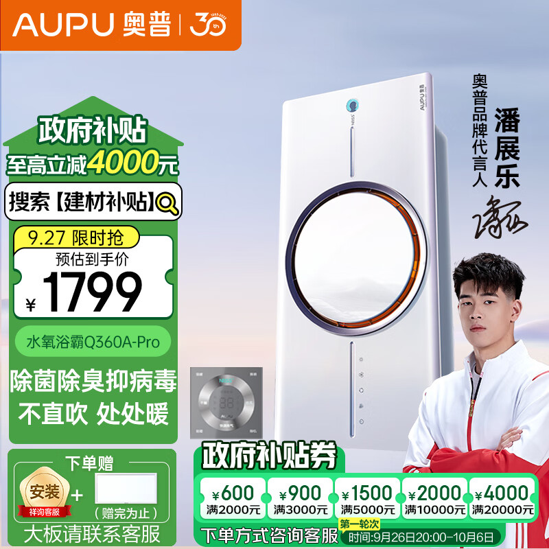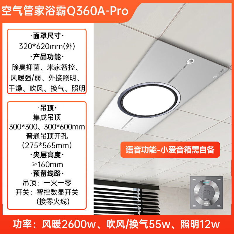 奥普(AUPU)浴霸Q360A-Pro风暖铂金水氧功能智显已接入米家(非大板安装SKU)价格:2299.00元!