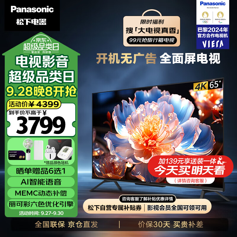 松下(Panasonic)电视LX580 65英寸 丽可彩4K屏MEMC AI语音开机无广告智能电视机TH-65LX580C价格:3799.00元!